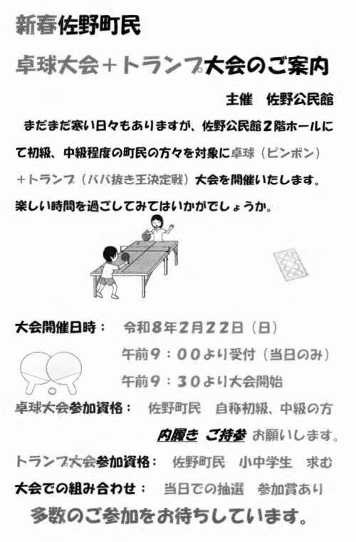 | 下記の通り、「新春佐野町民 卓球大会+トランプ大会」を開催します。 | |
